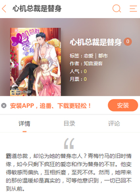 简介: 漫画《心机总裁是替身》简述:他是邪魅狂狷的霸道总裁,但是却沦为她的替身恋人?青梅竹马的旧时情缘,如今只剩下疯狂的爱恋和作为替身的不甘。现在的他变得敏感而偏执,将她狠狠的折磨!至死不休。然而,她带来的那份温暖却是真实的,可等他意识到他们的爱情的时候!,一切已回不到从前。